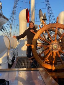 Vicky Zöller am Steuerrad der „Statsraad Lehmkuhl“, Foto: Vicky Zöller