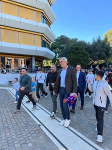 Es ist kurz nach 15 Uhr am Dienstag, den 18.11, als der Barça-Trainer vor der DSB aus dem Auto steigt. Direktor Michael Röhrig und eine große Schar begeisterter Schülerinnen und Schüler begrüßen ihn lautstark. Umringt von den jugendlichen Fans wird er ins Gebäude begleitet. In der Aula erwarten Hansi Flick geladene Gäste aus Elternschaft, Ehrenamtlichen, Sponsoren und zahlreichen ausgewählten Schülern, insbesondere die Klassensprecher und diejenigen, die sich rechtzeitig angemeldet hatten, um ihre Fragen loszuwerden.