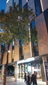 Die beiden Hotels und der links gelegene graue Flachbau der kleinen Stadtbibliothek bilden das Eingangsportal der Creu Coberta. Auf beiden Straßenseiten setzt sich die Creu Coberta nahezu endlos fort und lädt mit unzähligen kleinen Restaurants, Cafeterias und hell erleuchteten Schaufenstern von Mode- und Schuhgeschäften zum mehrstündigen Einkaufsbummel ein.