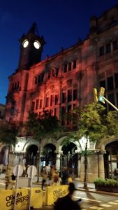 Weiter führt der Weg vorbei an Apotheken, Blumen- und Elektrogeschäften. Nach ein paar Metern erscheint zur Rechten der 1915 remodelierte modernistische Bau des Ajuntament de Sants-Montjuïc (erbaut 1885). Markant heben sich der Glocken-/Uhrenturm, das Wappen Barcelonas sowie die Personen- und Tierfiguren (Tauben, Uhu, Fuchs und Schlangen) an der Fassade hervor. Vorbei an Cafeterías, die in einer kleinen seitlichen Fußgängerzone ihre Gäste bewirten, geht es weiter auf der Carrer de Sants, wo sich wiederum Laden an Laden reiht.